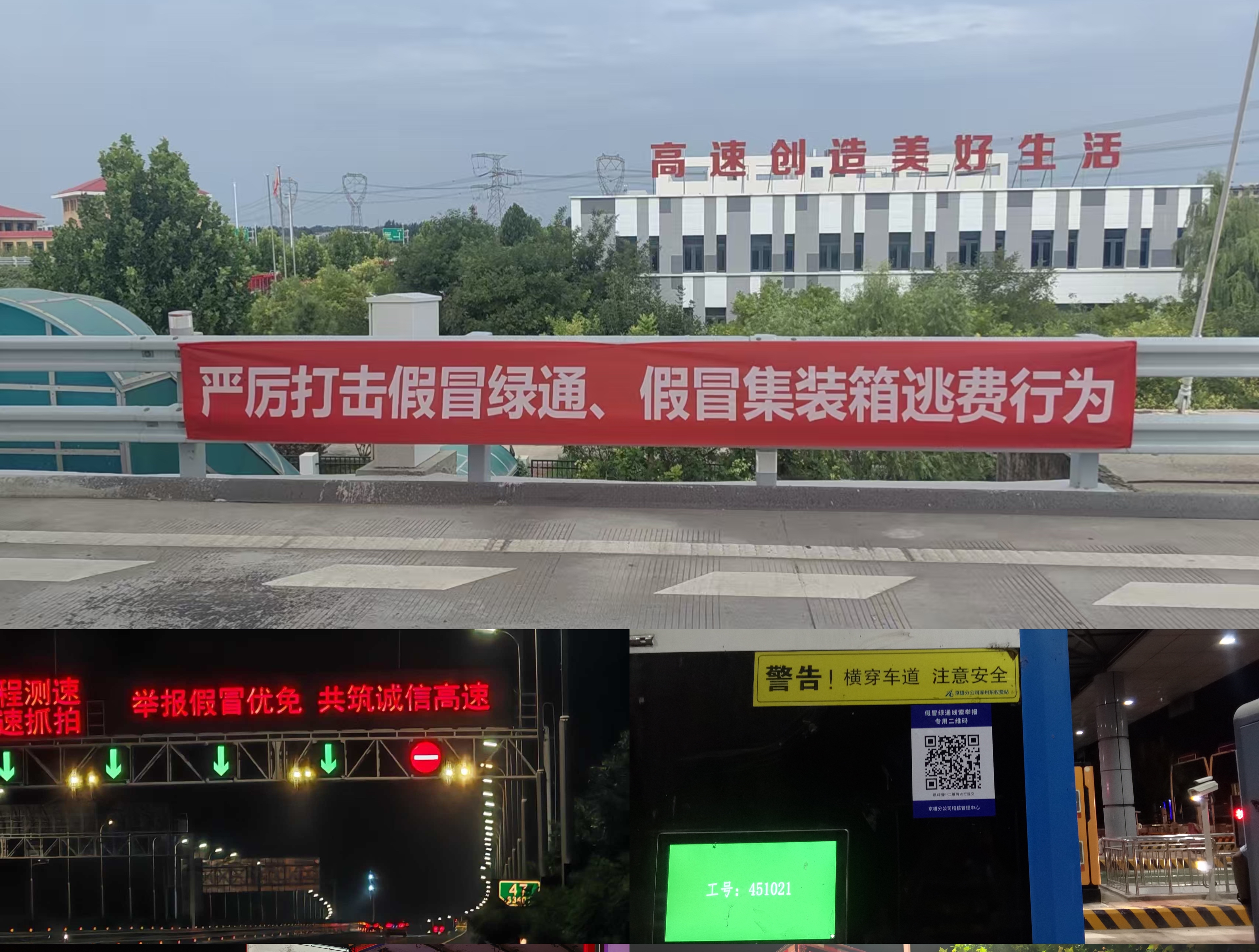 首先,强化宣传力度,拓宽社会监督渠道。稽核管理中心在收费站广场、车道显眼位置悬挂宣传标语,同时与指挥调度中心协作,利用可变情报板循环播放“优化收费环境,守护公平正义、举报假冒优免,共建诚信高速”等警示信息。在每个收费岗亭窗口外侧设置了“假冒绿通线索举报专用二维码”,多渠道、全方位地营造打击逃费行为的浓厚氛围,确保社会监督渠道的畅通。