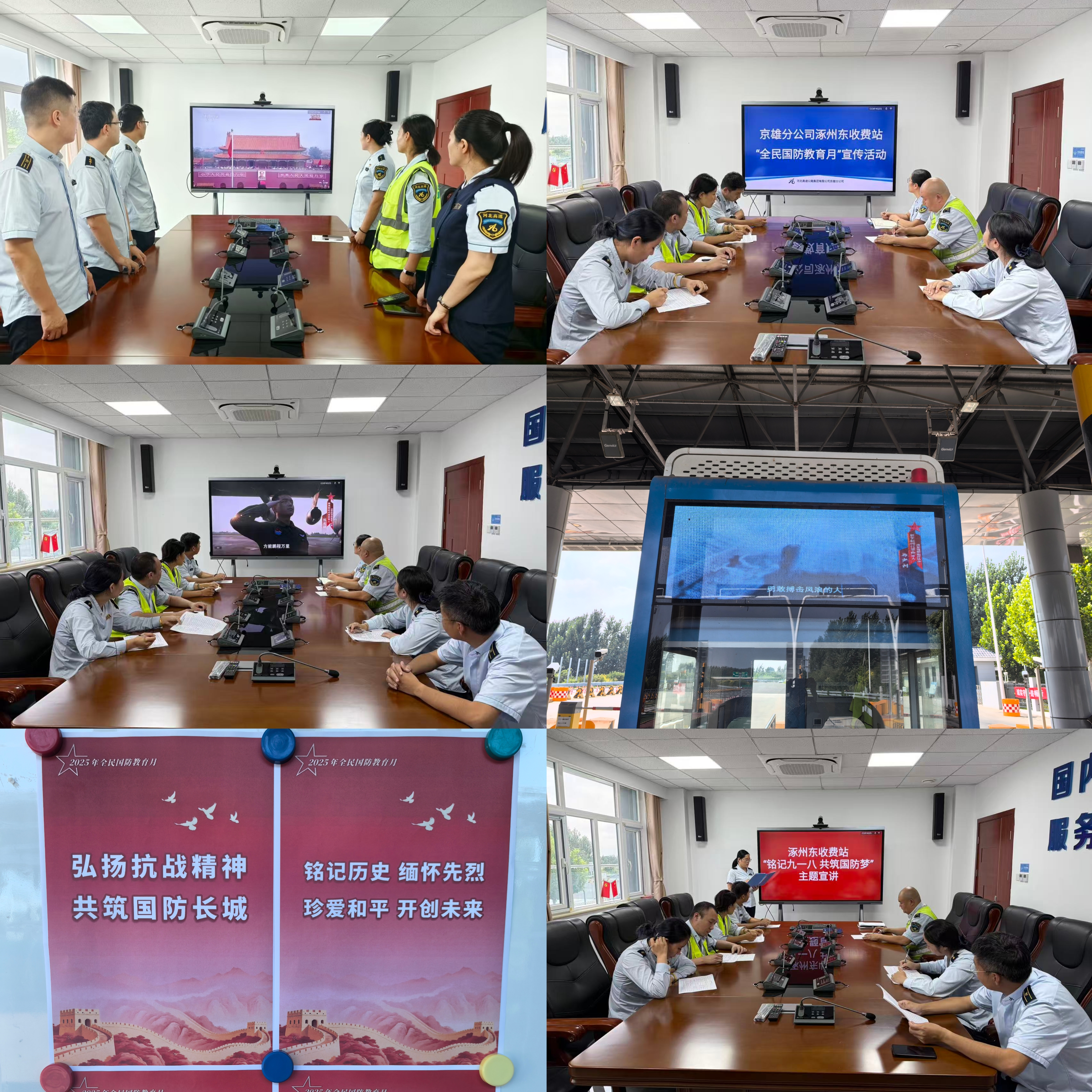 为深入贯彻学习贯彻习近平总书记关于加强全民国防教育的重要论述,进一步增强广大职工群众的国防观念和民防意识,普及国防知识、激发爱国热情,涿州东收费站积极响应上级号召,紧密围绕“弘扬抗战精神 共筑国防长城”这一主题,开展系列丰富多彩、形式多样的国防教育活动。