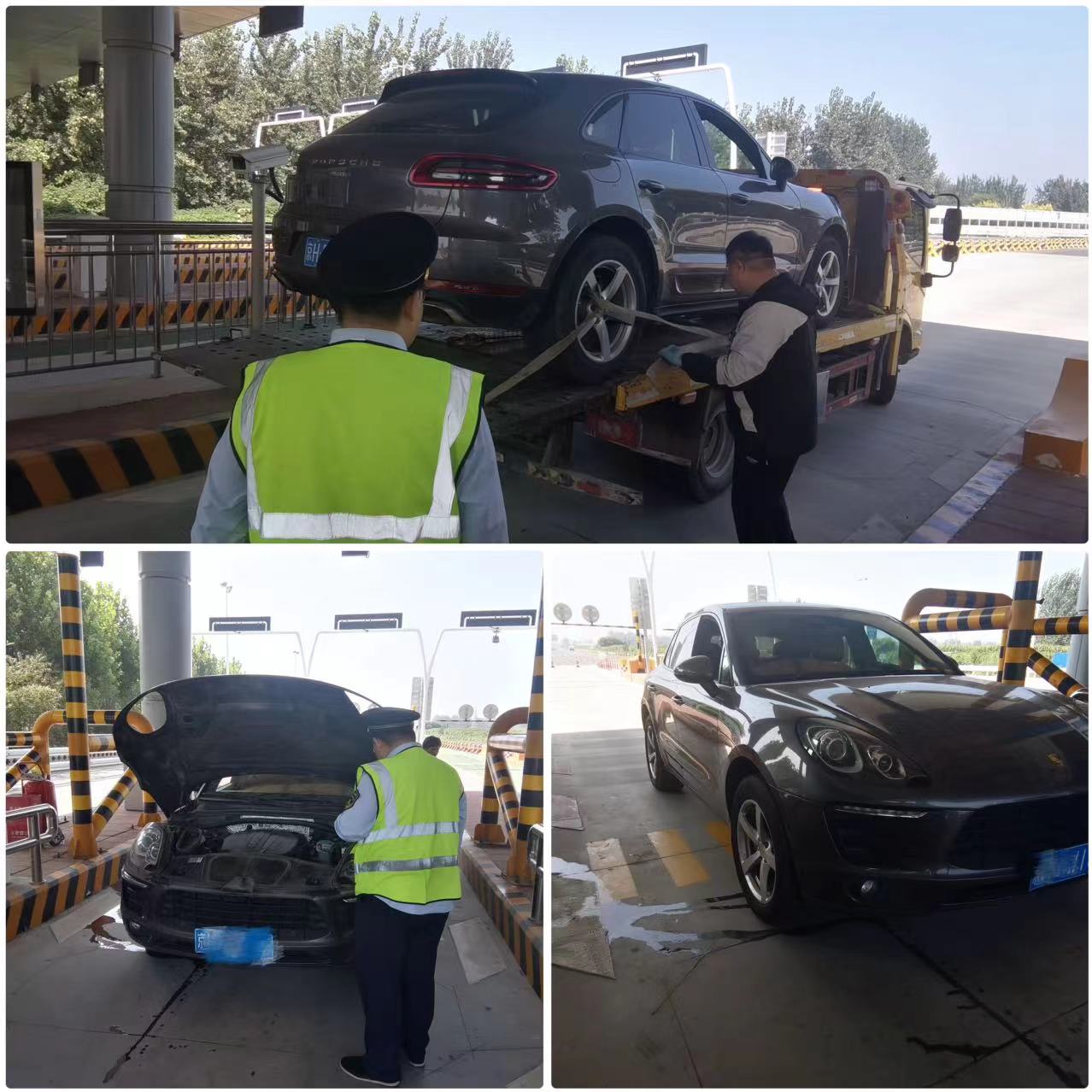 10月1日,一辆黑色轿车突发故障停在泗庄收费站ETC车道内,不再向前行驶。当班收费站班长发现这一情况后,立即主动询问。