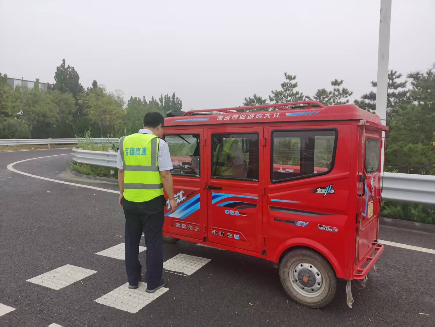 国庆期间,京雄高速高碑店东收费站始终坚守岗位,全力保障司乘人员的安全与畅通。一次日常巡查中,值班站长敏锐察觉一辆电动三轮车正试图驶入高速车道,他迅速反应,及时将其安全拦下。