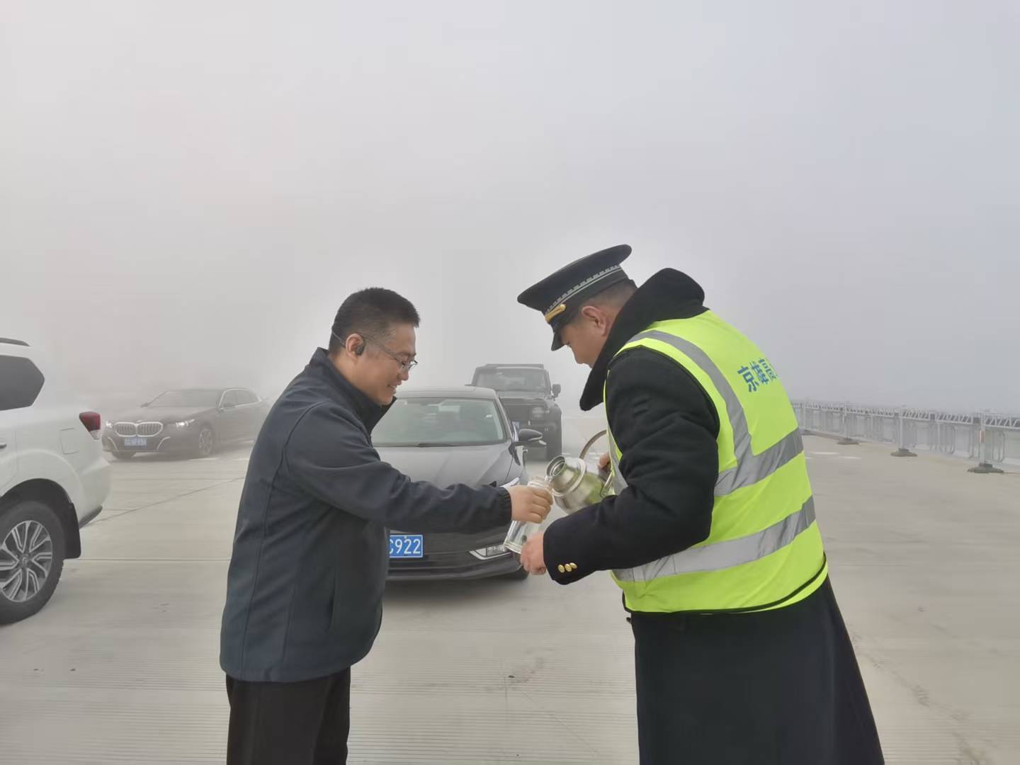 封道期间,收费员迅速组成服务点,将暖壶灌满的热水,逐车为司乘人员递上。“师傅,喝点热水暖暖身子,封道是为了安全,再耐心等等~”一句句贴心问候、一杯杯暖心热水,驱散了大雾带来的焦灼。同时,收费员还主动为司乘答疑解惑,实时播报路况信息,提醒大家做好防寒措施,引导现场秩序井然。
