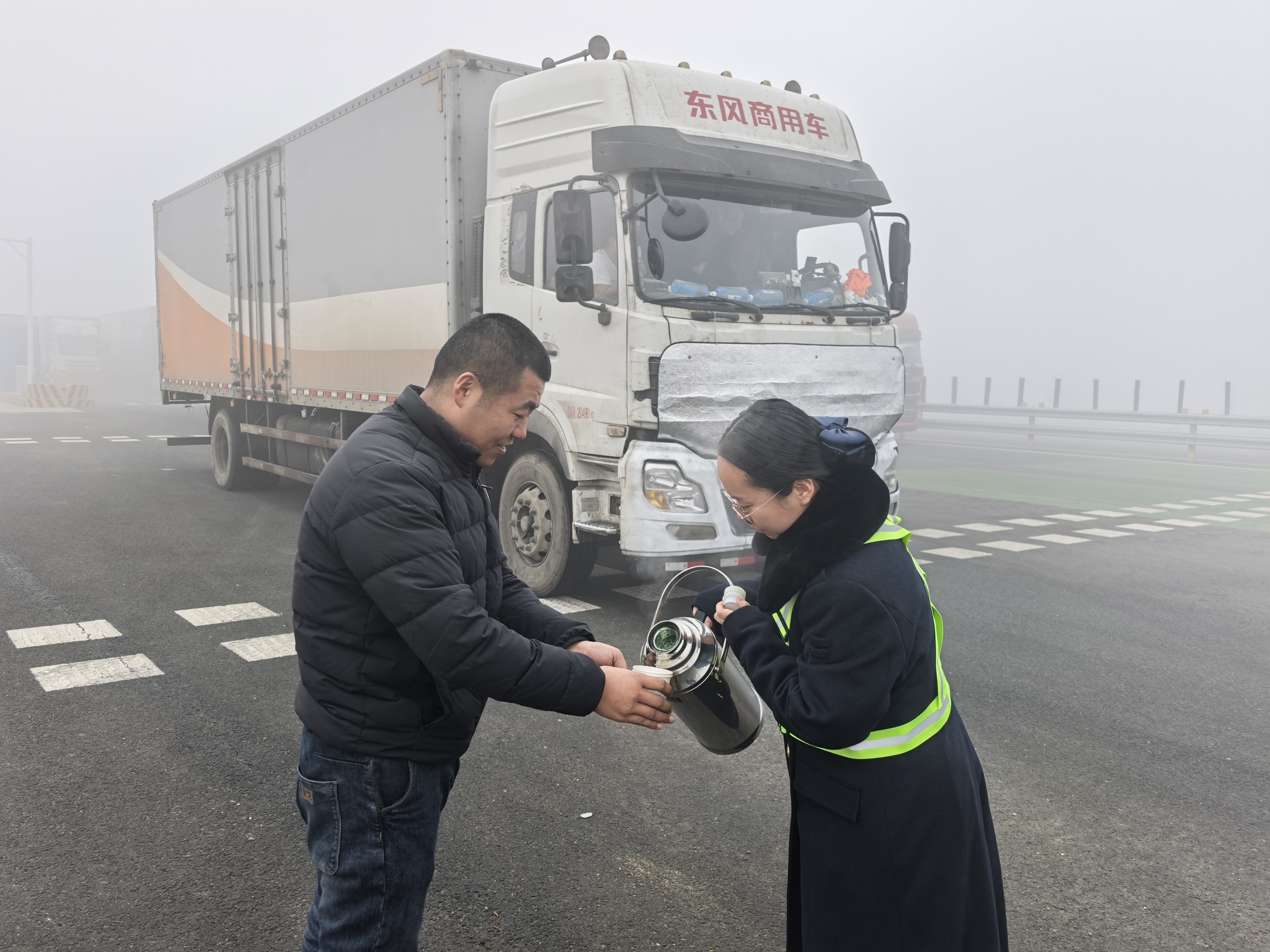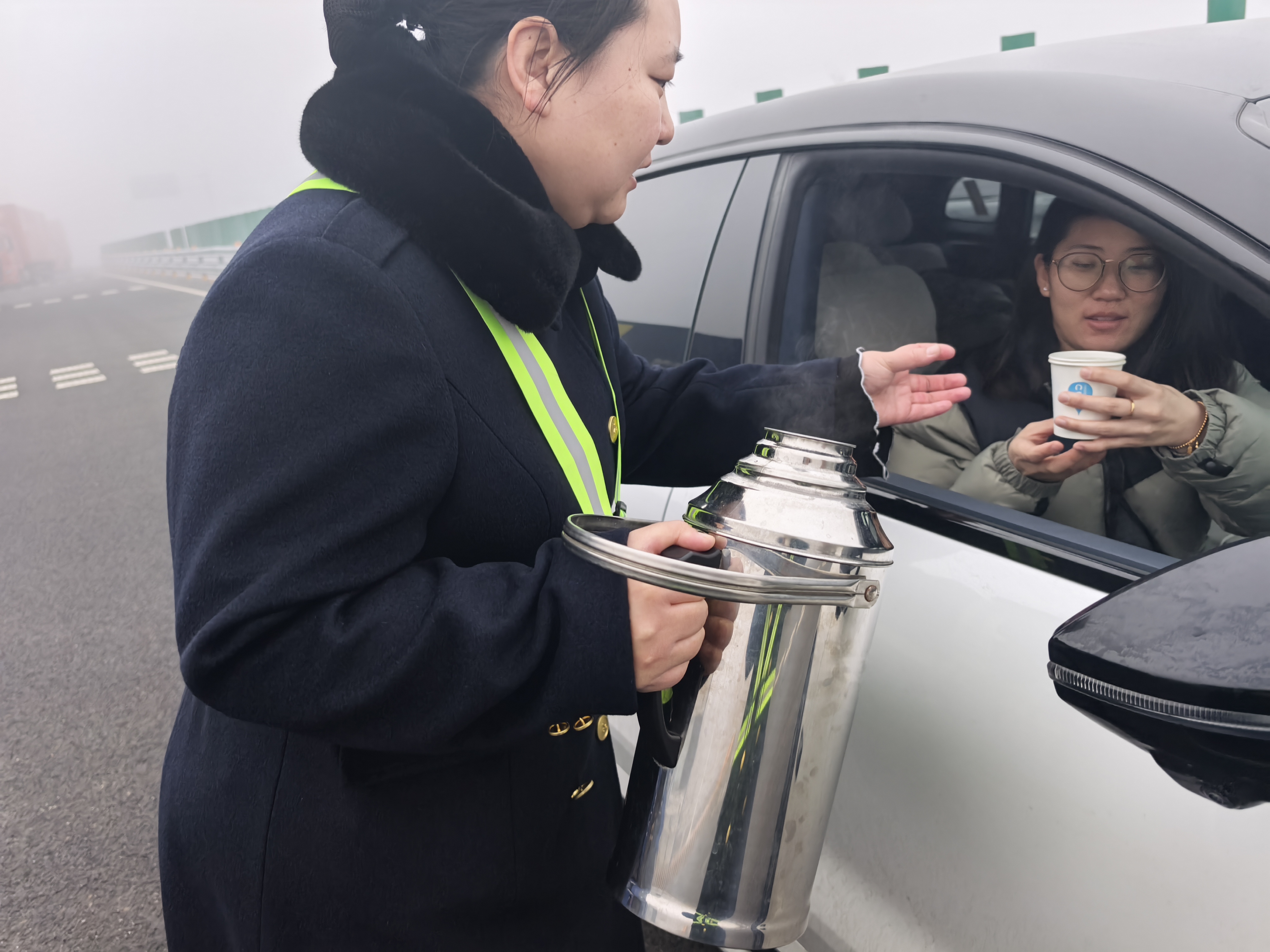 收费广场上,工作人员穿梭于车辆之间,主动为滞留的司乘递上一杯杯热水,温暖在寒雾中传递。一位常年奔波的长途货车司机感动地说:“你们京雄的服务是真的好!”除了提供热水,工作人员还当起了“活地图”。他们耐心地为每一位有需要的司乘人员指引路线,详细介绍周边可通行的道路以及附近的休息场所、餐饮地点等信息。对于那些不熟悉当地路况的外地司机,工作人员更是格外用心,反复叮嘱关键路口和安全驾驶注意事项,让等候的时光变为一份安心。
