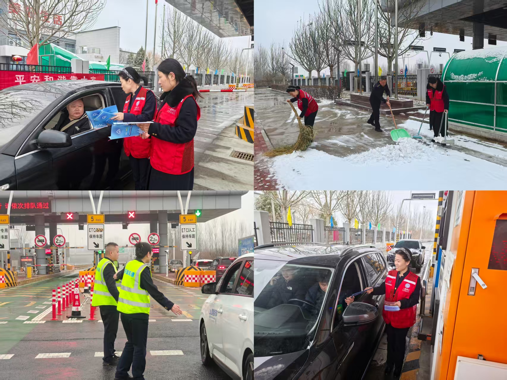 站区以党建为引领,强化责任落实,优化保通预案,加强车道巡查与设备巡检,确保收费系统、车道设施稳定运行。针对两会期间车流特点,科学调配人员,志愿者深入一线疏导,快速处置特情。另一方面,及时组织人员开展扫雪作业,对站区车道及院区等区域进行全面清理,全力提升通行效率,严防拥堵与安全风险。