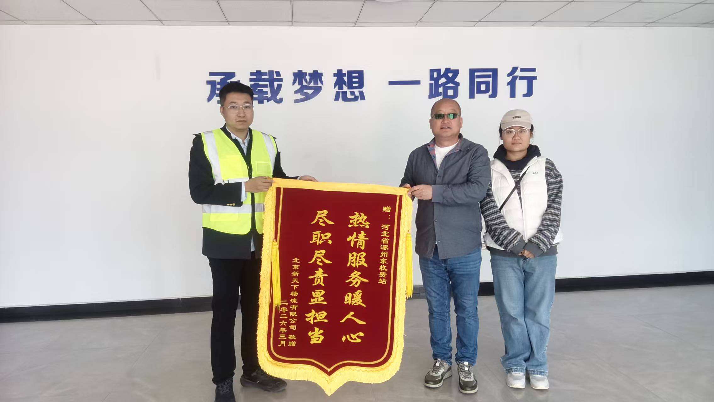 3月9日上午,北京新天下物流有限公司职工代表专程来到涿州东收费站,将一面印有“尽心尽责显担当 热情服务暖人心”的锦旗送到值班站长手中,以此表达对收费站高效保障、贴心服务的诚挚谢意。
