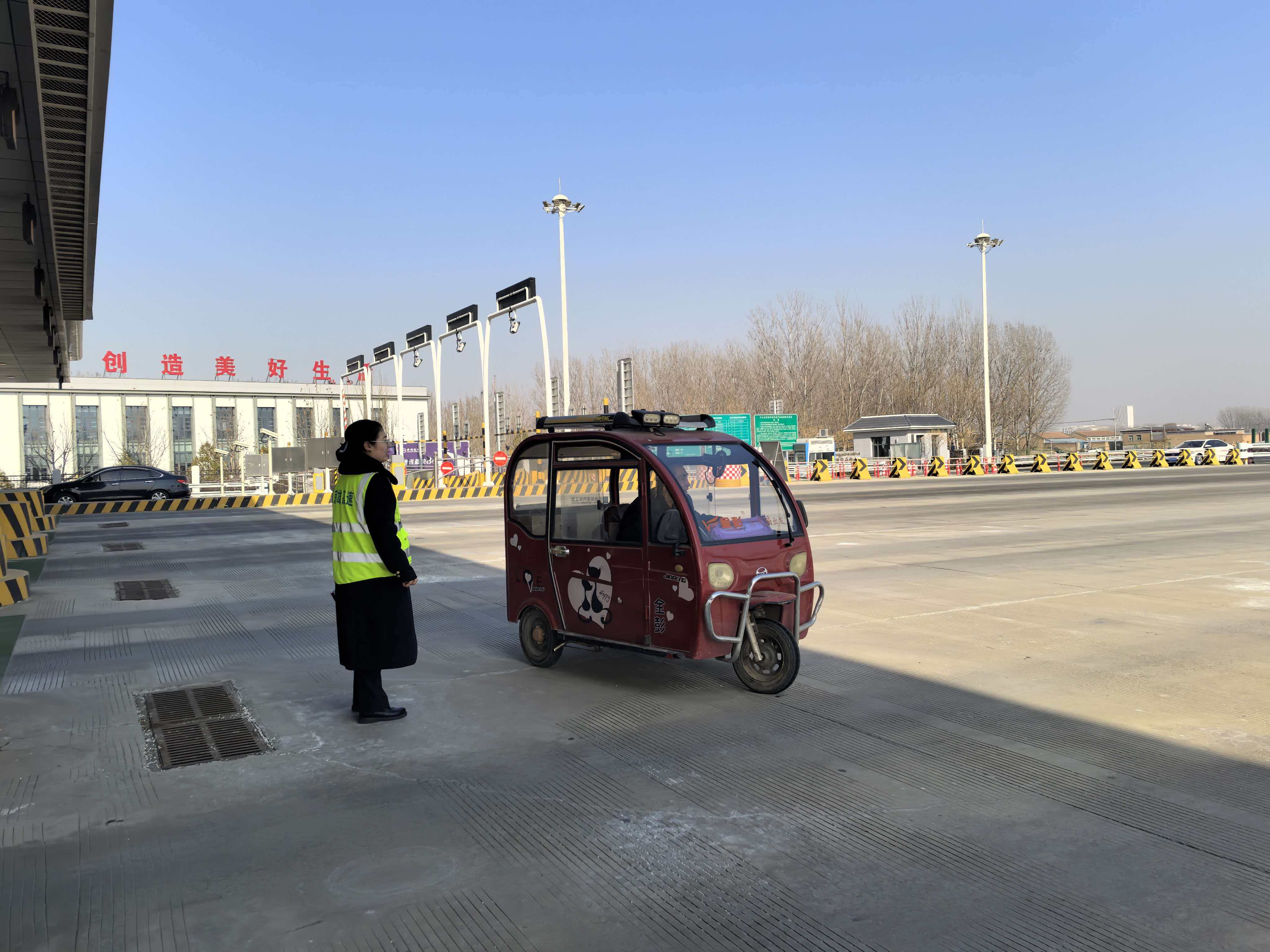 作业期间,一辆三轮车突然驶入收费站外广场,存在极大道路安全隐患。收费人员第一时间发现险情,迅速小跑上前紧急拦截,与此同时,收费站行人监测系统同步发出警报,形成“人工+智能”双重安全响应。